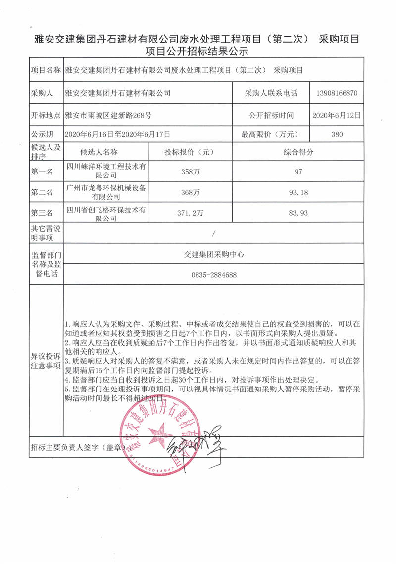 雅安交建集團丹石建材有限公司廢水處理工程項目(第二次)采購項目公開招標(biāo)結(jié)果公示