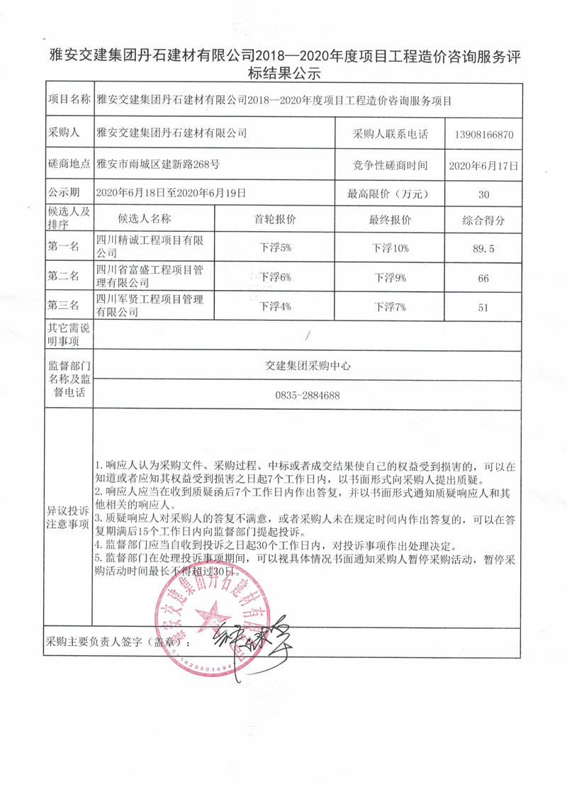 雅安交建集團(tuán)丹石建材有限公司2018—2020年度項(xiàng)目工程造價(jià)咨詢服務(wù)評標(biāo)結(jié)果公示