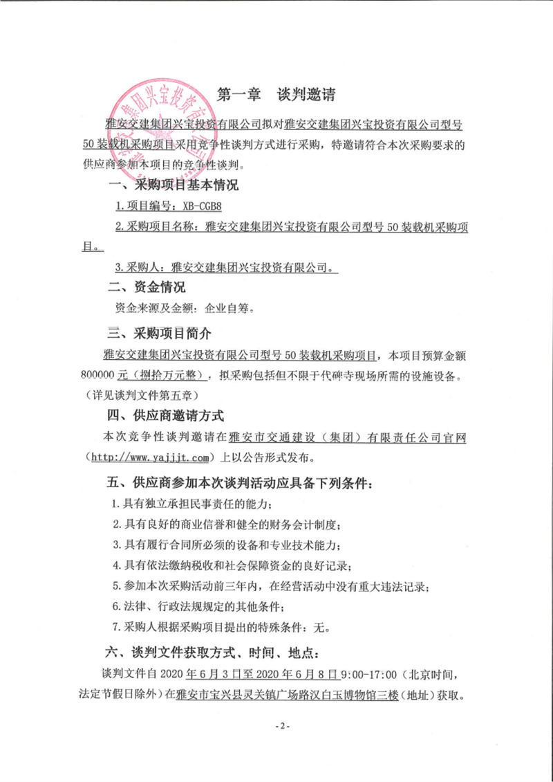 雅安交建集團(tuán)興寶投資有限公司型號50裝載機(jī)采購項(xiàng)目(第二次)競爭性談判公告