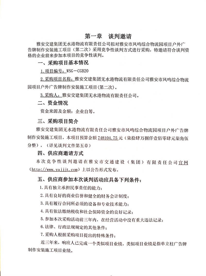 雅安交建集團(tuán)無水港物流有限責(zé)任公司雅安市鳳鳴綜合物流園項(xiàng)目戶外廣告牌制作安裝施工項(xiàng)目(第二次)競爭性談判公告