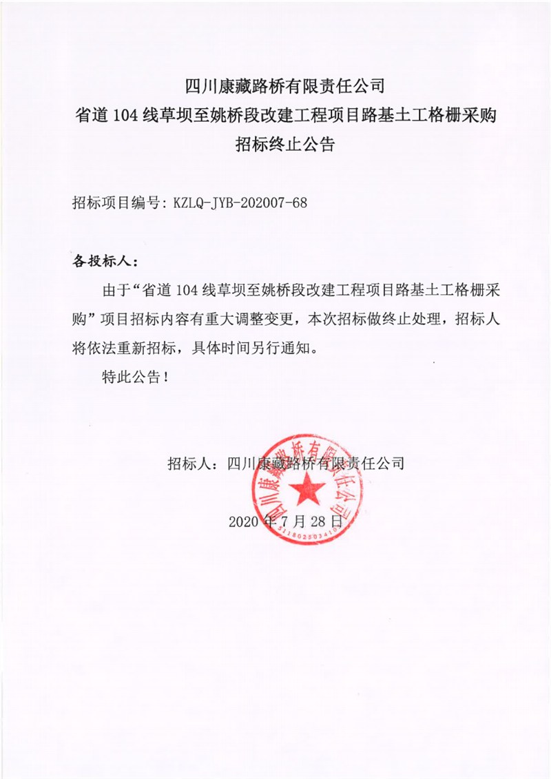 四川康藏路橋有限公司省道104線草壩至姚橋段改建工程項(xiàng)目路基土工格柵采購(gòu)招標(biāo)終止公告