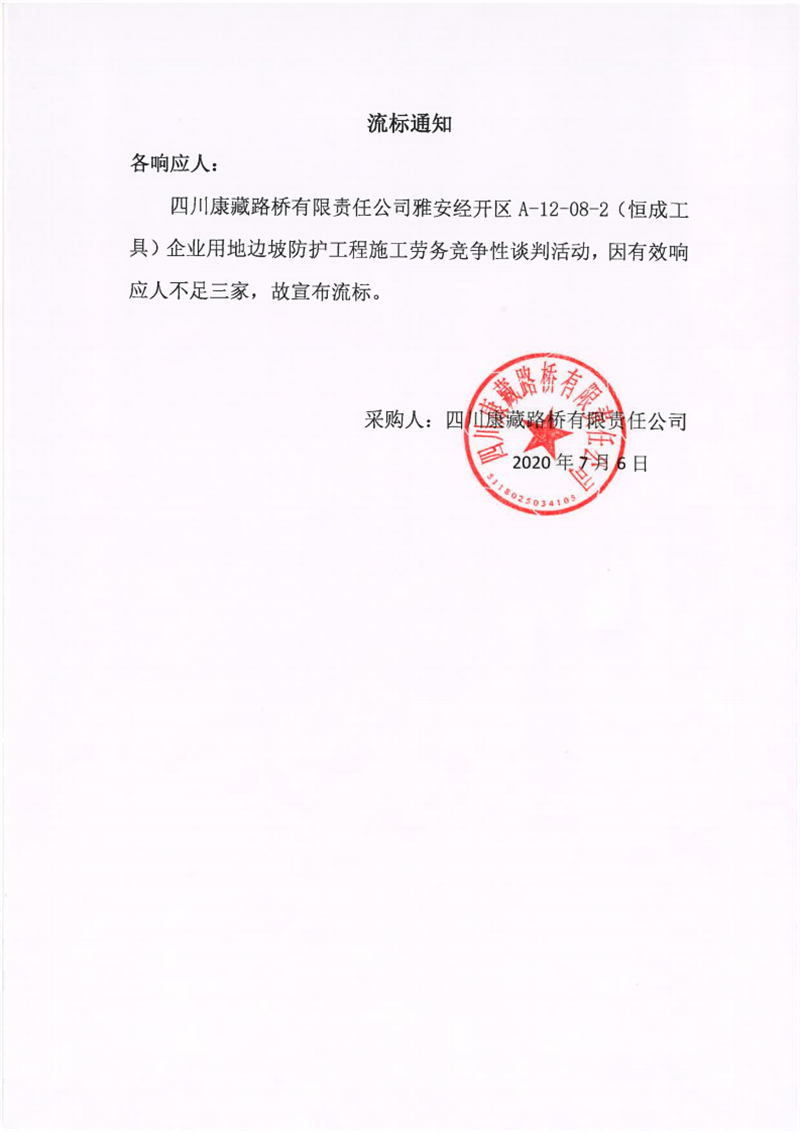 四川康藏路橋有限責(zé)任公司雅安經(jīng)開區(qū)A-12-08-2(恒成工具)企業(yè)用地邊坡防護工程施工勞務(wù)流標(biāo)通知