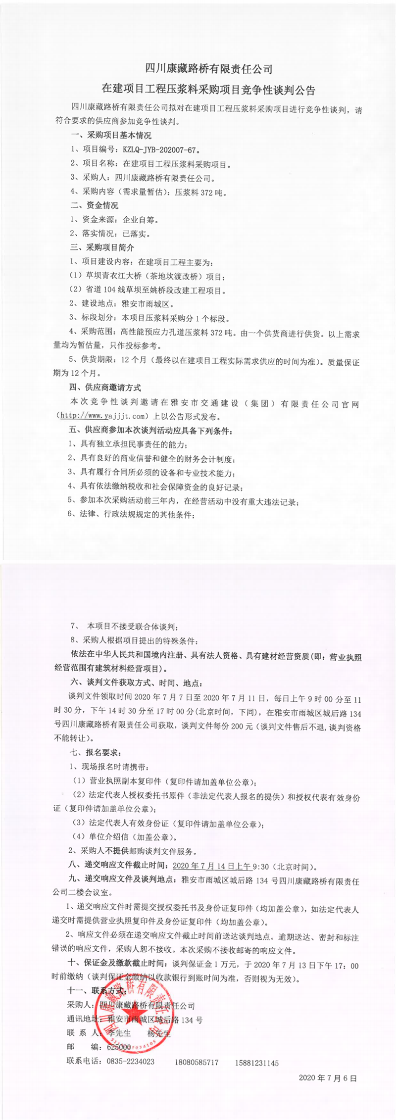 四川康藏路橋有限責(zé)任公司在建項(xiàng)目工程壓漿料采購項(xiàng)目競(jìng)爭性談判公告