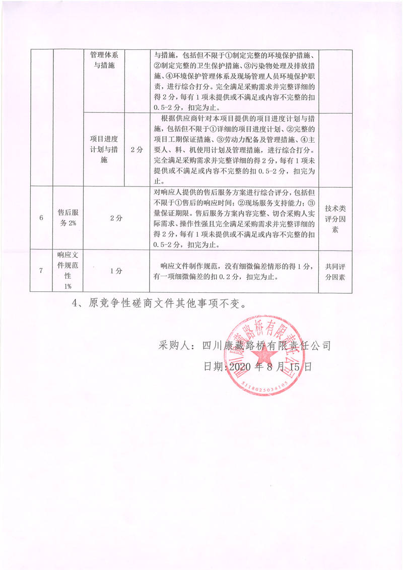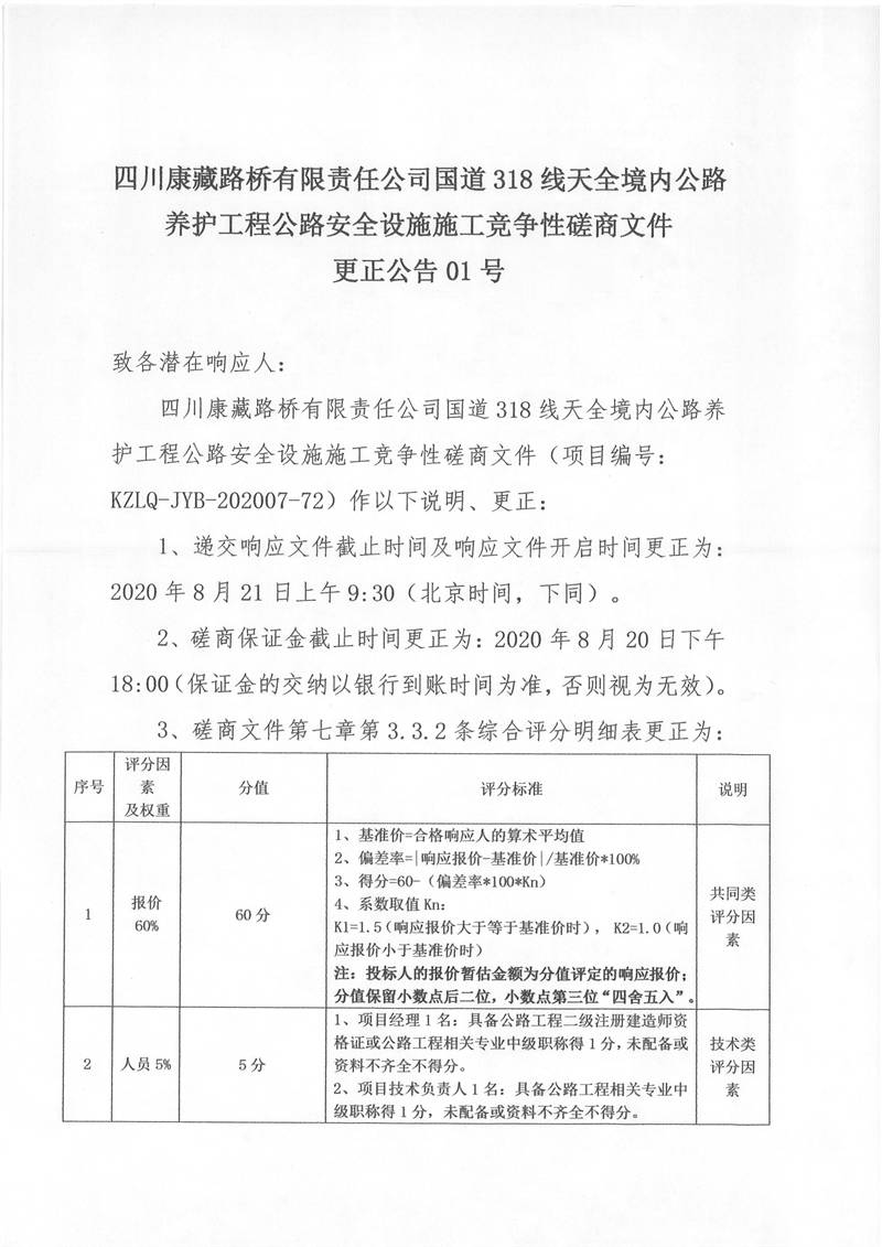 四川康藏路橋有限責任公司國道318線天全境內(nèi)公路養(yǎng)護工程公路安全設施施工競爭性磋商文件更正公告01號