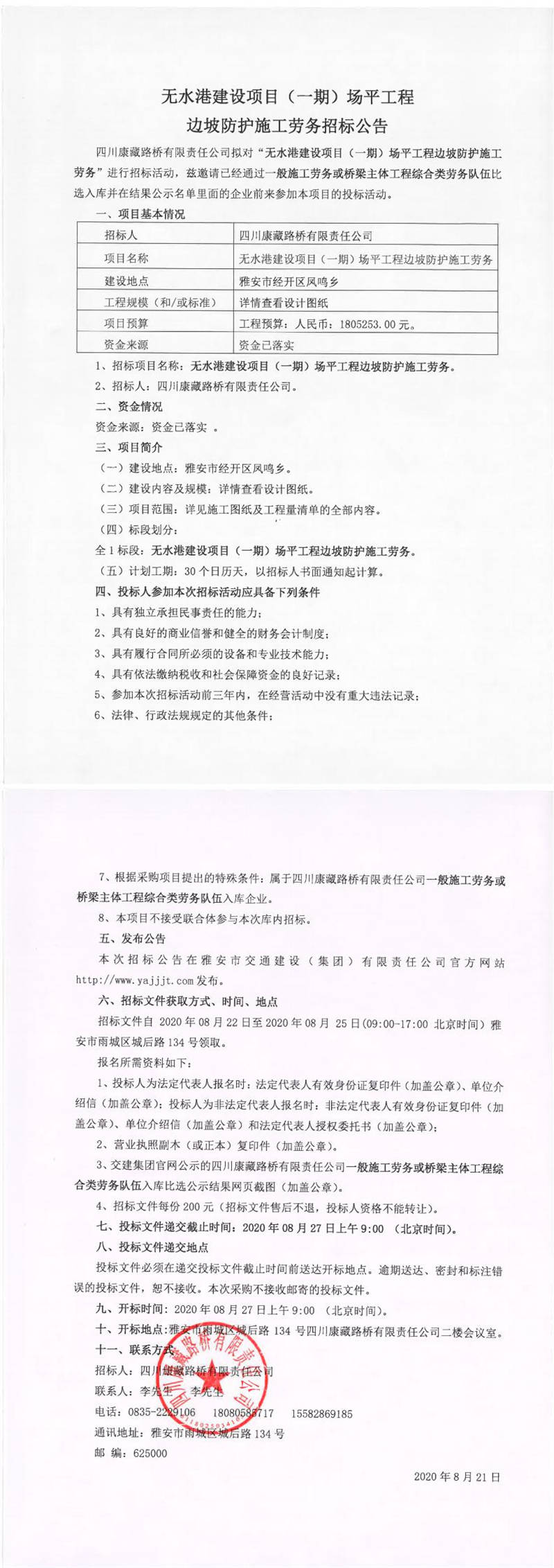 四川康藏路橋有限責(zé)任公司無(wú)水港建設(shè)項(xiàng)目(一期)場(chǎng)平工程邊坡防護(hù)施工勞務(wù)招標(biāo)公告