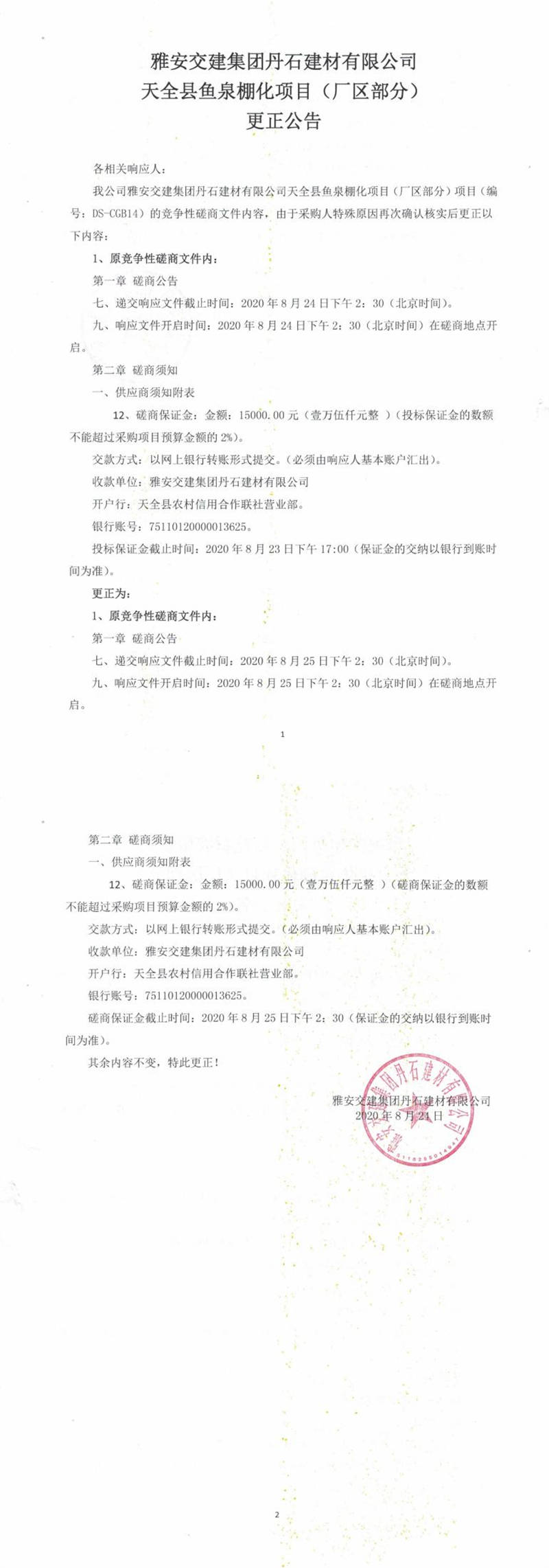雅安交建集團丹石建材有限公司天全縣魚泉棚化項目(廠區(qū)部分)更正公告