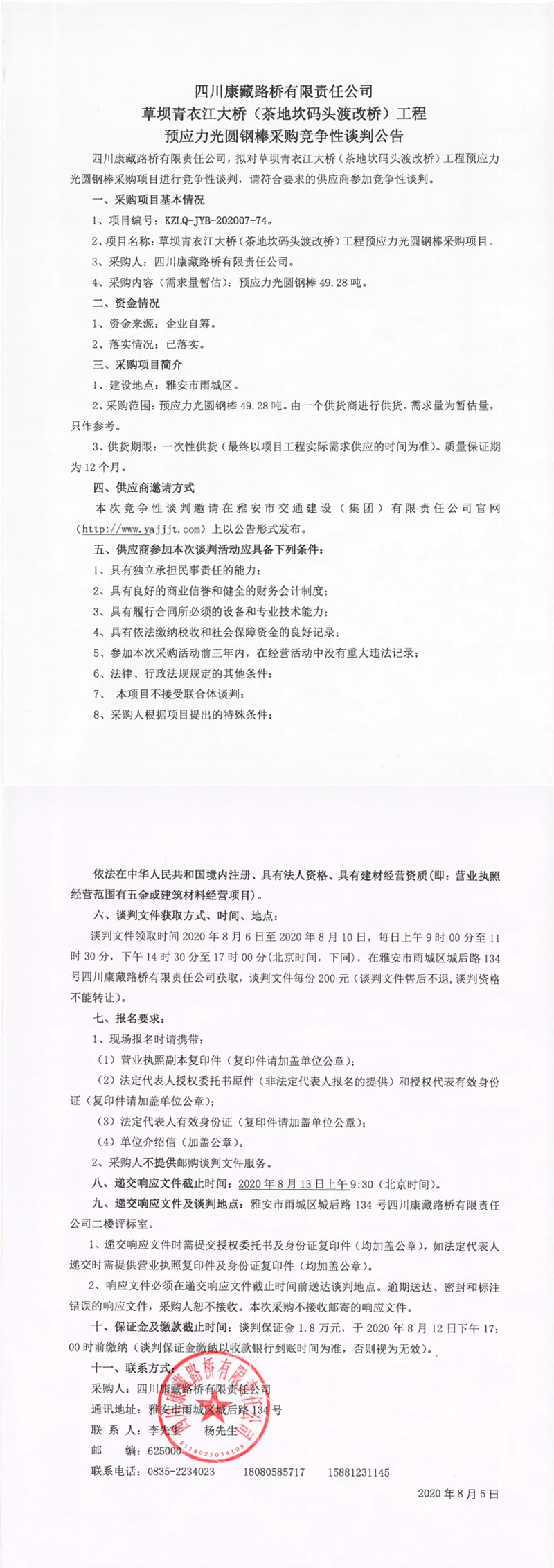 四川康藏路橋有限責(zé)任公司草壩青衣江大橋(茶地坎碼頭渡改橋)工程預(yù)應(yīng)力光圓鋼棒采購競(jìng)爭性談判公告