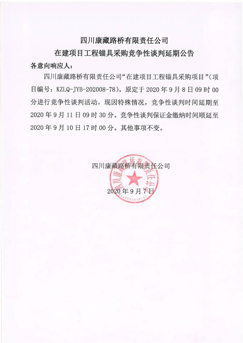 四川康藏路橋有限責(zé)任公司在建項(xiàng)目工程錨具采購(gòu)競(jìng)爭(zhēng)性談判延期公告