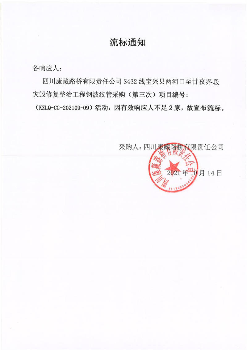 四川康藏路橋有限責(zé)任公司S432線寶興縣兩河口至甘孜界段災(zāi)毀修復(fù)整治工程鋼波紋管采購(第三次)競價公告