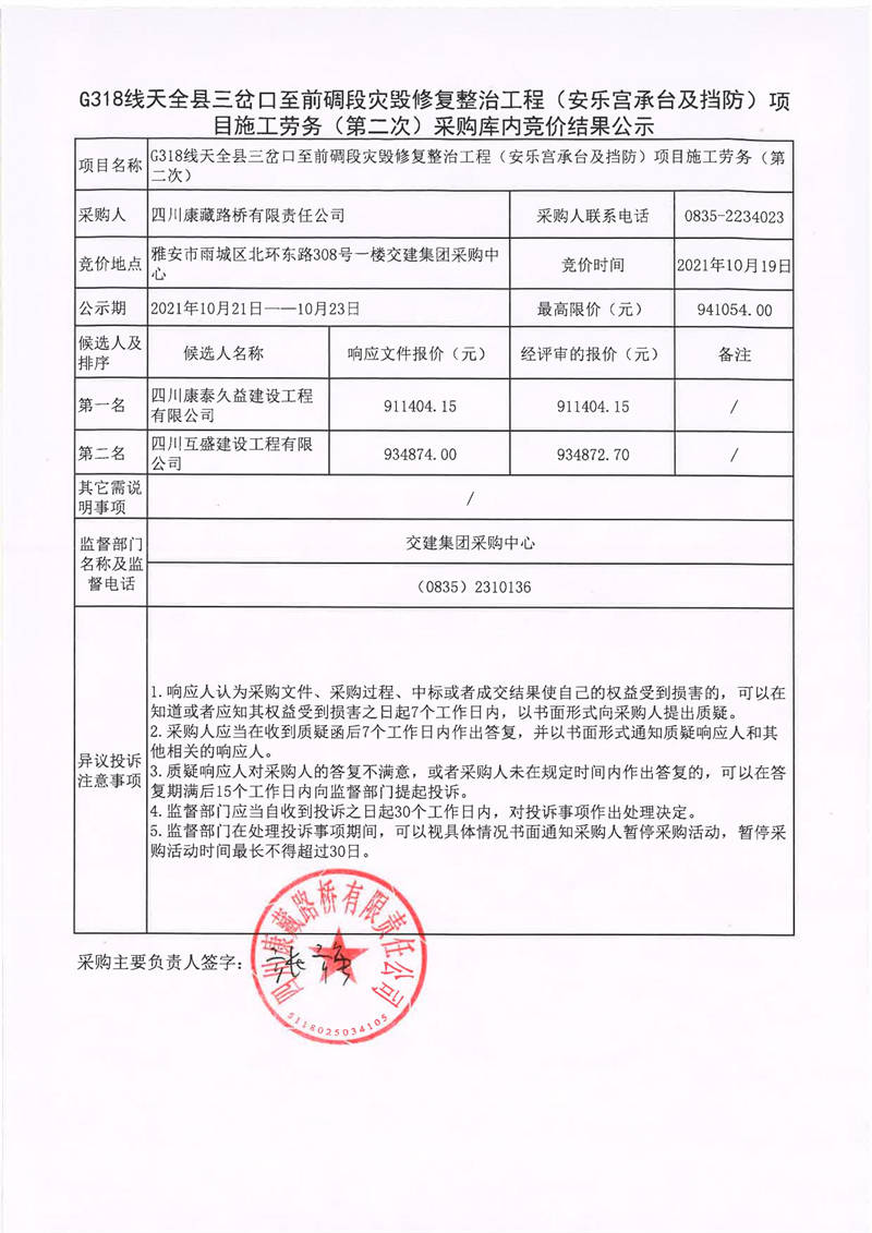 四川康藏路橋有限責任公司G318線天全縣三岔口至前碉段災毀修復整治工程(安樂宮承臺及擋防)項目施工勞務(第二次)采購庫內競價結果公示