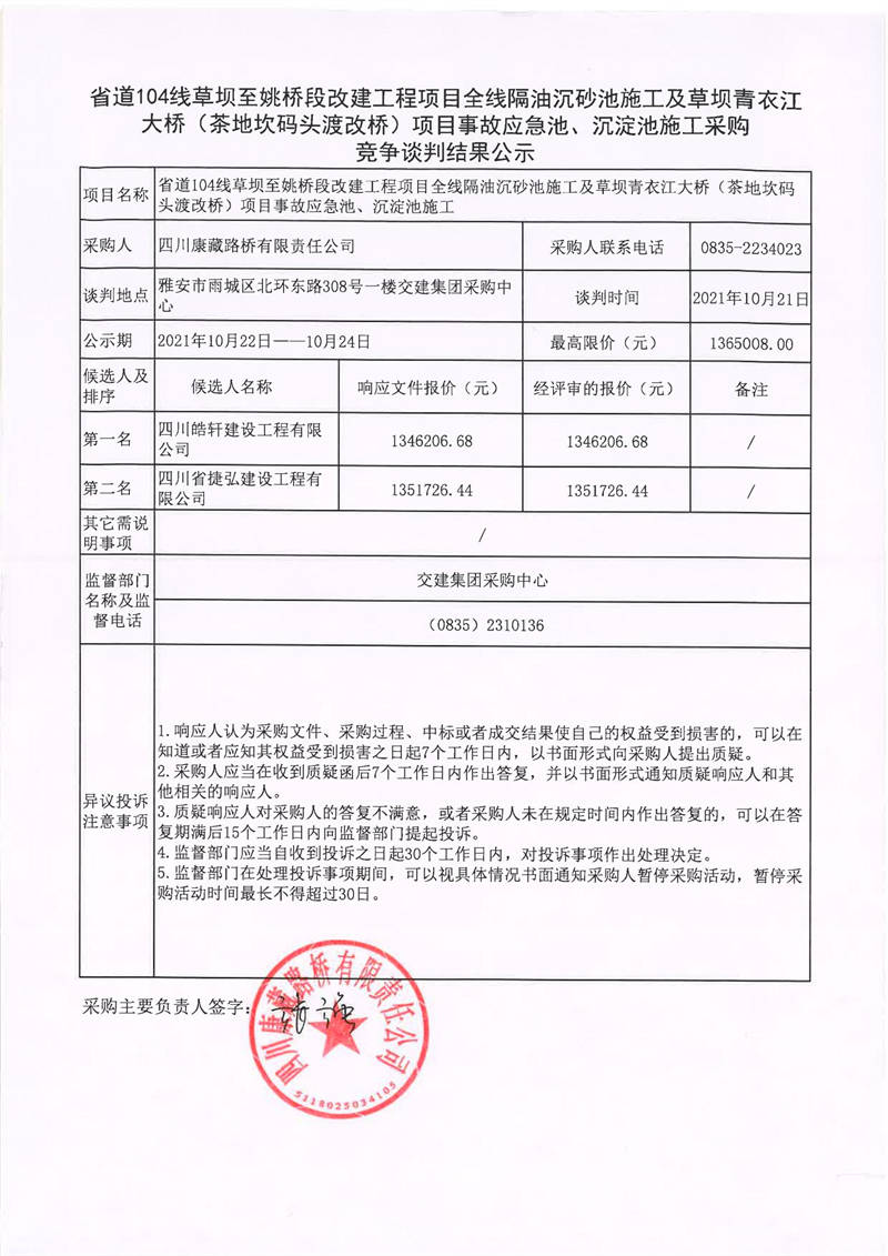 四川康藏路橋有限責任公司省道104線草壩至姚橋段改建工程項目全線隔油沉砂池施工及草壩青衣江大橋(茶地坎碼頭渡改橋)項目事故應(yīng)急池、沉淀池施工采購競爭談判結(jié)果公示