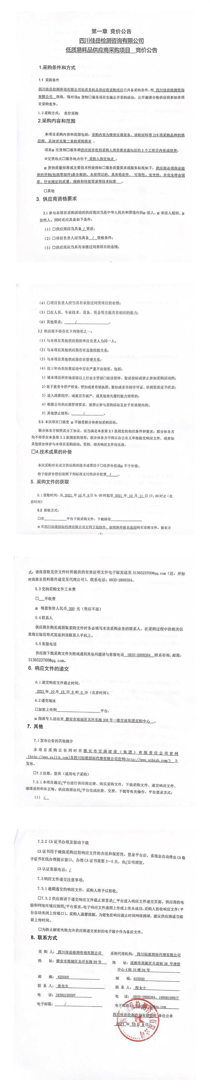 四川佳岳檢測(cè)咨詢有限公司低質(zhì)易耗品供應(yīng)商采購項(xiàng)目競(jìng)價(jià)公告