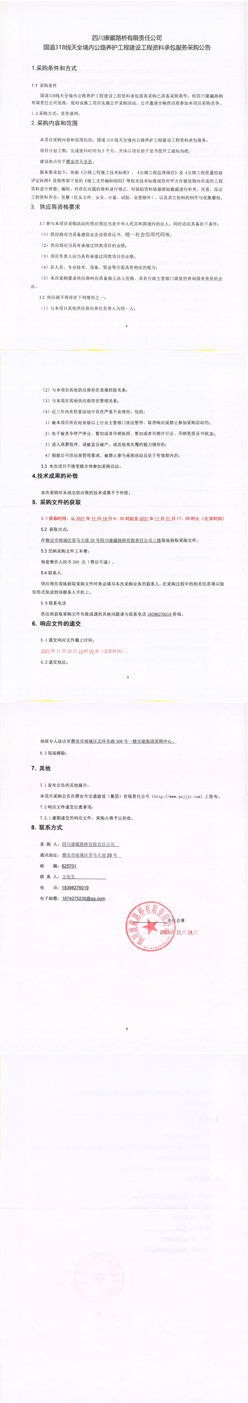 四川康藏路橋有限責(zé)任公司國道318線天全境內(nèi)公路養(yǎng)護(hù)工程建設(shè)工程資料承包服務(wù)采購公告