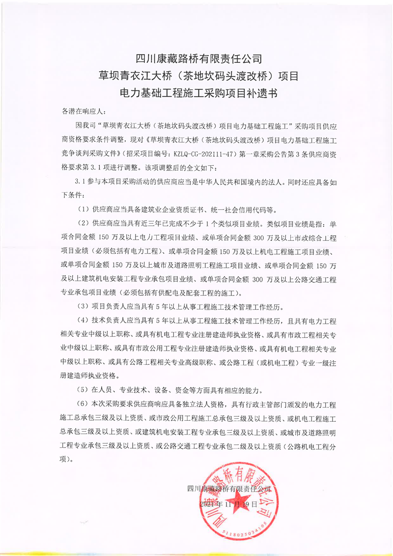 四川康藏路橋有限責任公司草壩青衣江大橋(茶地坎碼頭渡改橋)項目電力基礎工程施工采購項目補遺書