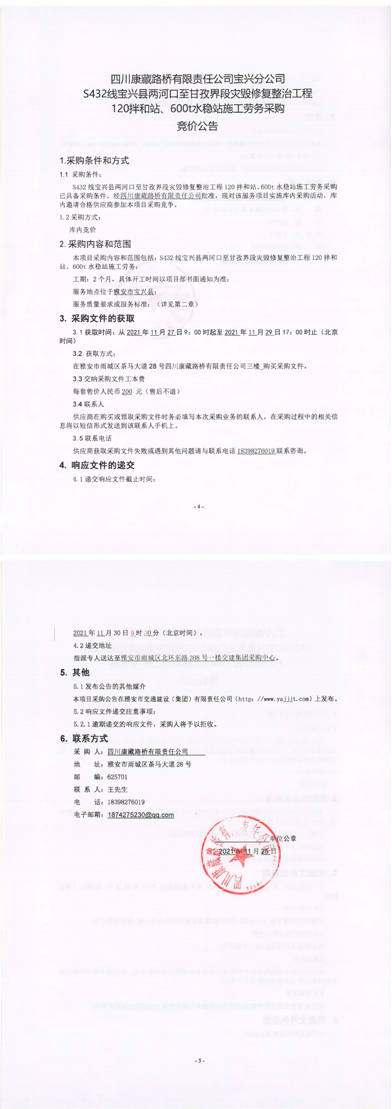 四川康藏路橋有限責任公司S432線寶興縣兩河口至甘孜界段災(zāi)毀修復(fù)整治工程120拌合站、600t水穩(wěn)站施工勞務(wù)采購競價公告