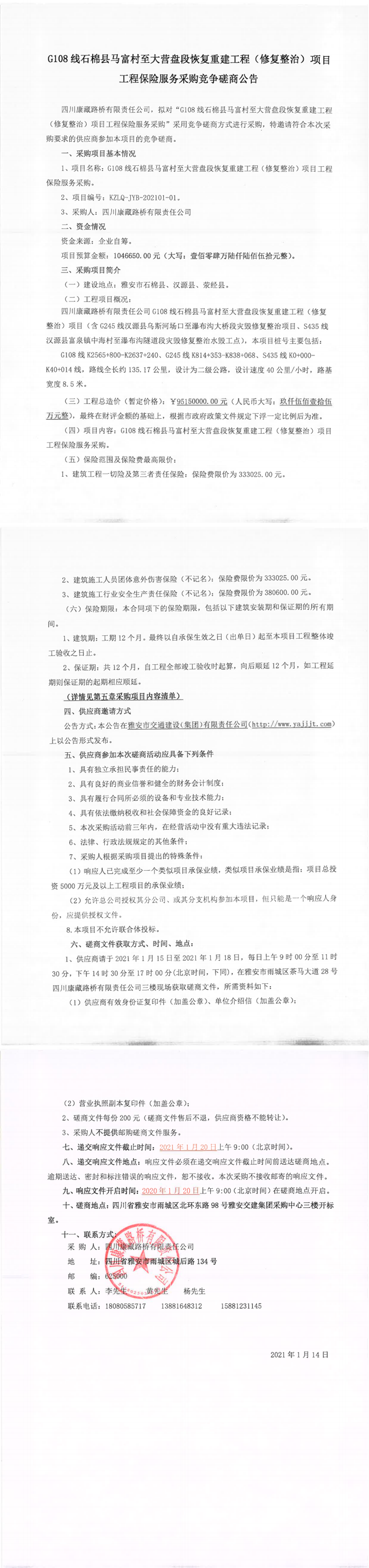 四川康藏路橋有限公司G108線石棉縣馬富村至大營(yíng)盤段恢復(fù)重建工程(修復(fù)整治)項(xiàng)目工程保險(xiǎn)服務(wù)采購(gòu)競(jìng)爭(zhēng)磋商公告