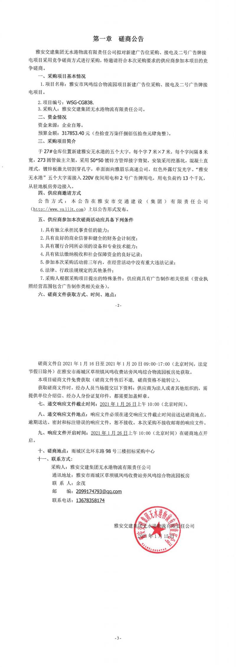 雅安交建集團(tuán)無水港物流有限責(zé)任公司雅安市鳳鳴綜合物流園項目新建廣告位采購、接電及二號廣告牌接電項目磋商公告