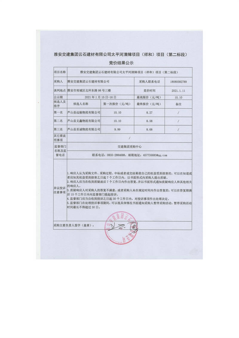 雅安交建集團(tuán)云石建材有限公司太平河清障項目(王河壩)項目(第一標(biāo)段)競價結(jié)果公示