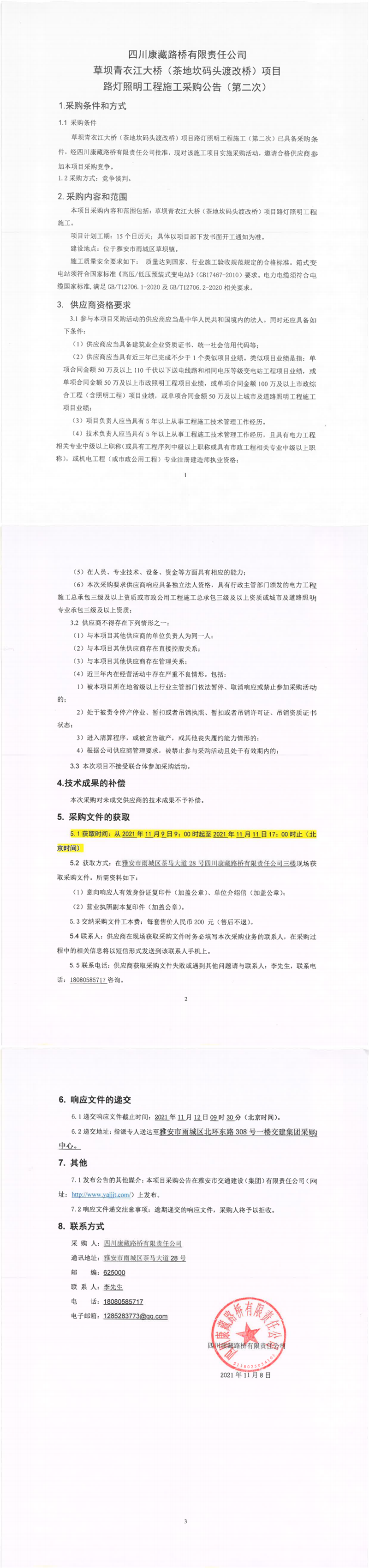 四川康藏路橋有限責(zé)任公司草壩青衣江大橋(茶地坎碼頭渡改橋)項目路燈照明工程施工采購公告(第二次)