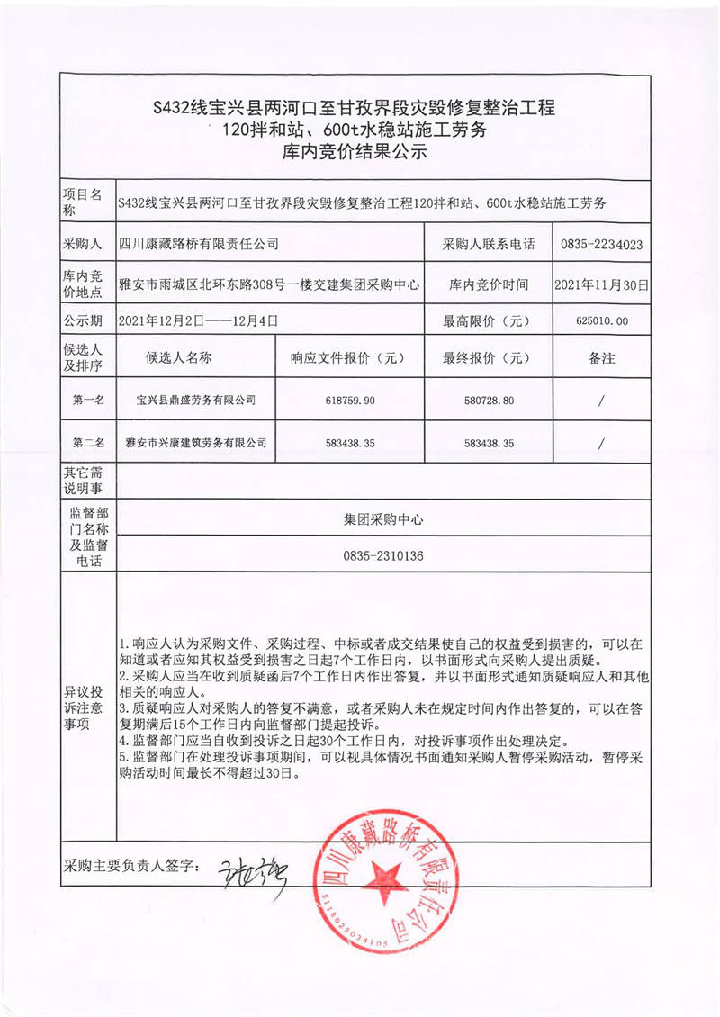 四川康藏路橋有限責(zé)任公司S432線寶興縣兩河口至甘孜界段災(zāi)毀修復(fù)整治工程120拌和站、600t水穩(wěn)站施工勞務(wù)庫內(nèi)競價(jià)結(jié)果公示