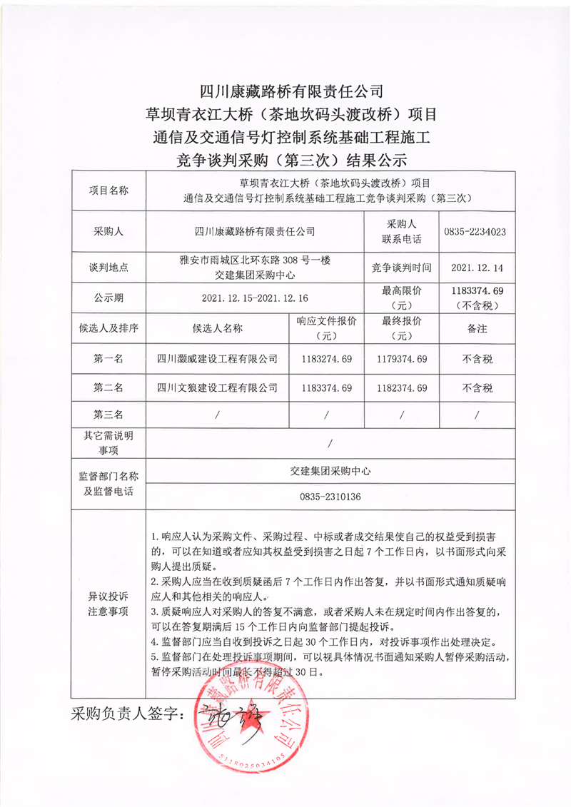四川康藏路橋有限責(zé)任公司草壩青衣江大橋(茶地坎碼頭渡改橋)項(xiàng)目通信及交通信號(hào)燈控制系統(tǒng)基礎(chǔ)工程施工競(jìng)爭(zhēng)談判采購(第三次)結(jié)果公示