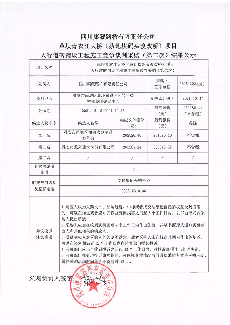 四川康藏路橋有限責(zé)任公司草壩青衣江大橋(茶地坎碼頭渡改橋)項(xiàng)目人行道磚鋪設(shè)工程施工競(jìng)爭(zhēng)談判采購(gòu)(第二次)結(jié)果公示