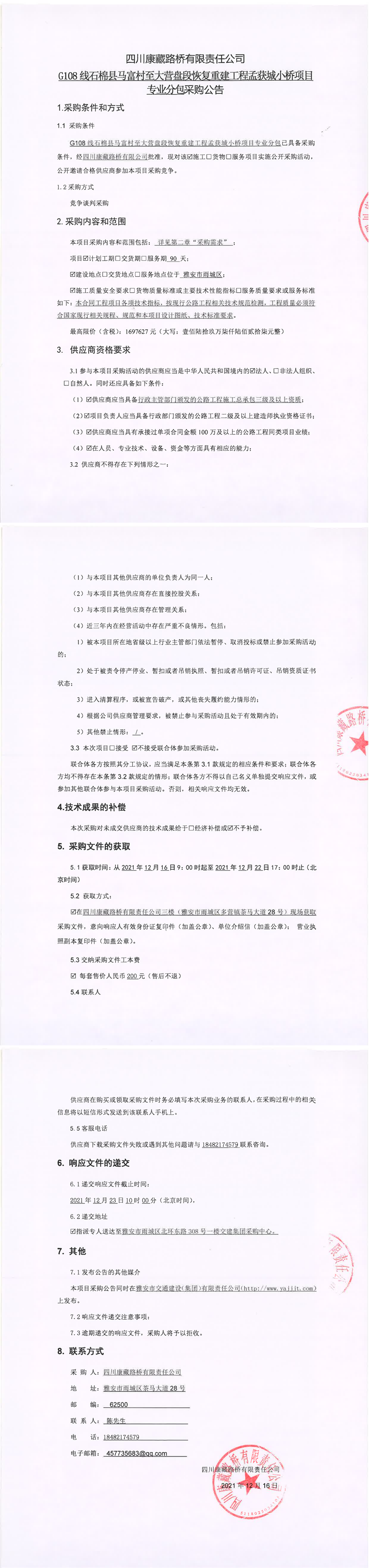 四川康藏路橋有限責(zé)任公司G108線石棉縣馬富村至大營盤段恢復(fù)重建工程孟獲城小橋項目專業(yè)分包采購公告