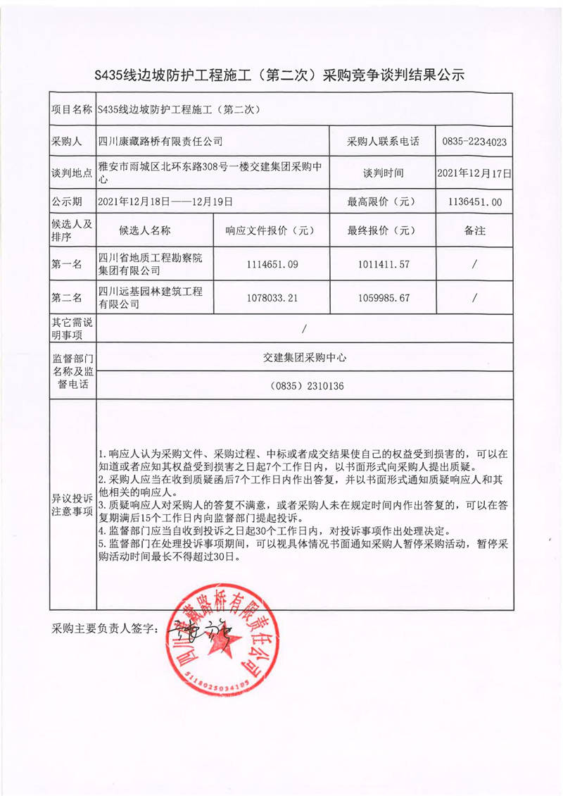 四川康藏路橋有限責任公司S435線邊坡防護工程施工(第二次)采購競爭談判結(jié)果公示