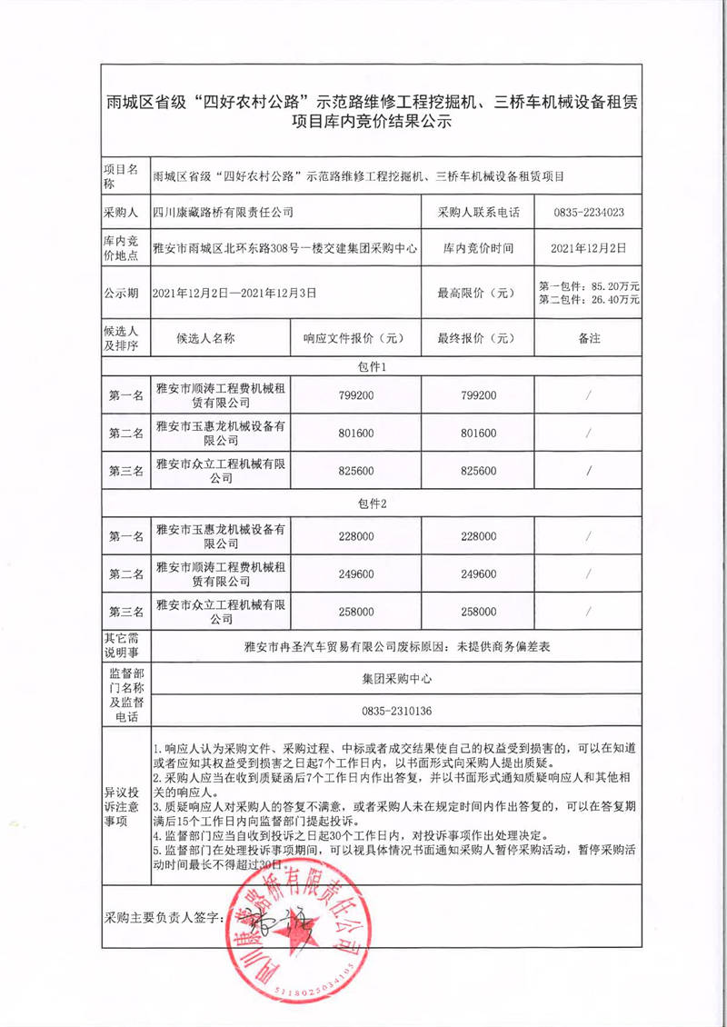 四川康藏路橋有限責任公司雨城區(qū)省級“四好農村路”示范路維修工程挖掘機、三橋車機械設備租賃項目庫內競價結果公示