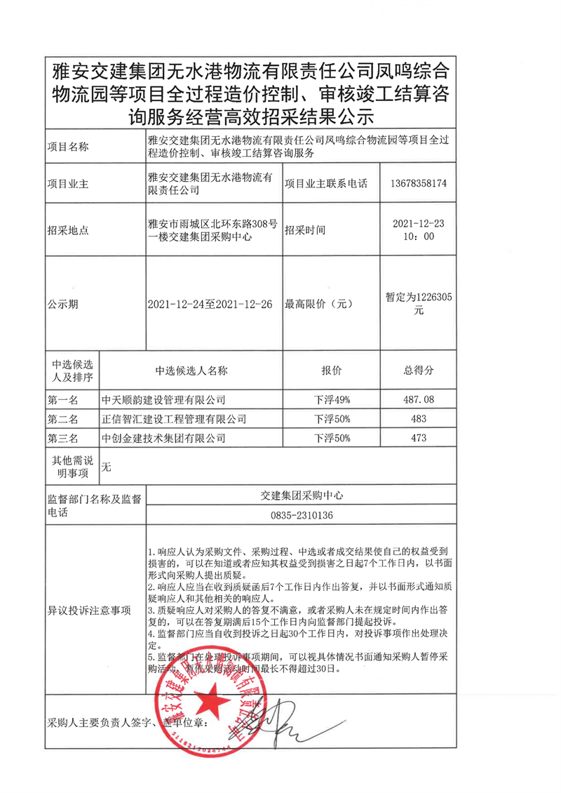 雅安交建集團(tuán)無水港物流有限責(zé)任公司鳳鳴綜合物流等項(xiàng)目全過程造價控制、審核竣工結(jié)算咨詢服務(wù)經(jīng)營高效招采結(jié)果公示