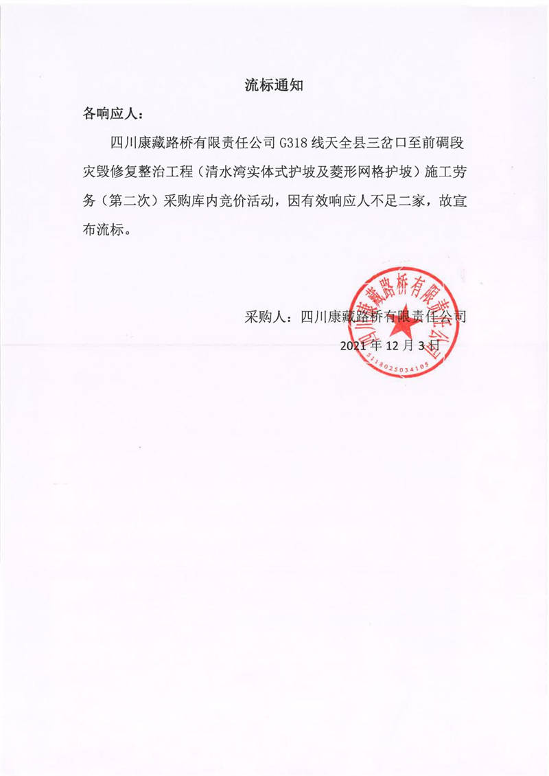 四川康藏路橋有限責任公司G318線天全縣三岔口至前碉段災毀修復整治工程(清水灣實體式護坡及菱形網(wǎng)格護坡)施工勞務(第二次)采購流標通知