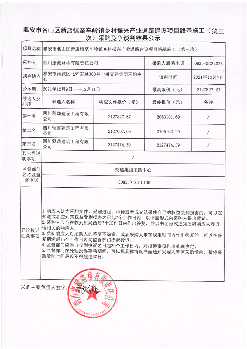 四川康藏路橋有限責任公司雅安市名山區(qū)新店鎮(zhèn)至車嶺鎮(zhèn)鄉(xiāng)村振興產業(yè)道路建設項目路面施工(第三次)采購競爭談判結果公示
