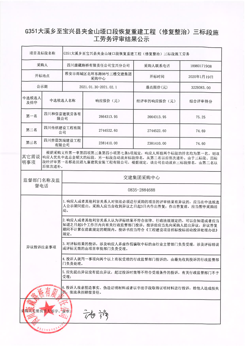 四川康藏路橋有限責任公司G351大溪鄉(xiāng)至寶興縣夾金山埡口段恢復(fù)重建工程(修復(fù)整治)三標段施工勞務(wù)評審結(jié)果公示