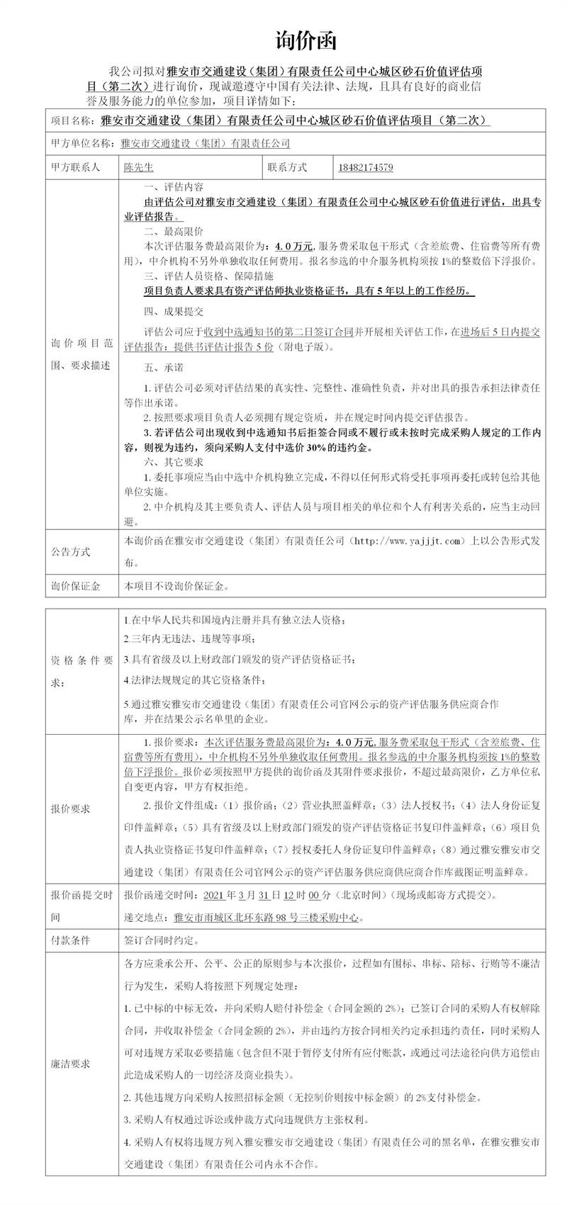 雅安市交通建設(shè)(集團(tuán))有限責(zé)任公司中心城區(qū)砂石價(jià)值評估項(xiàng)目(第二次)詢價(jià)函