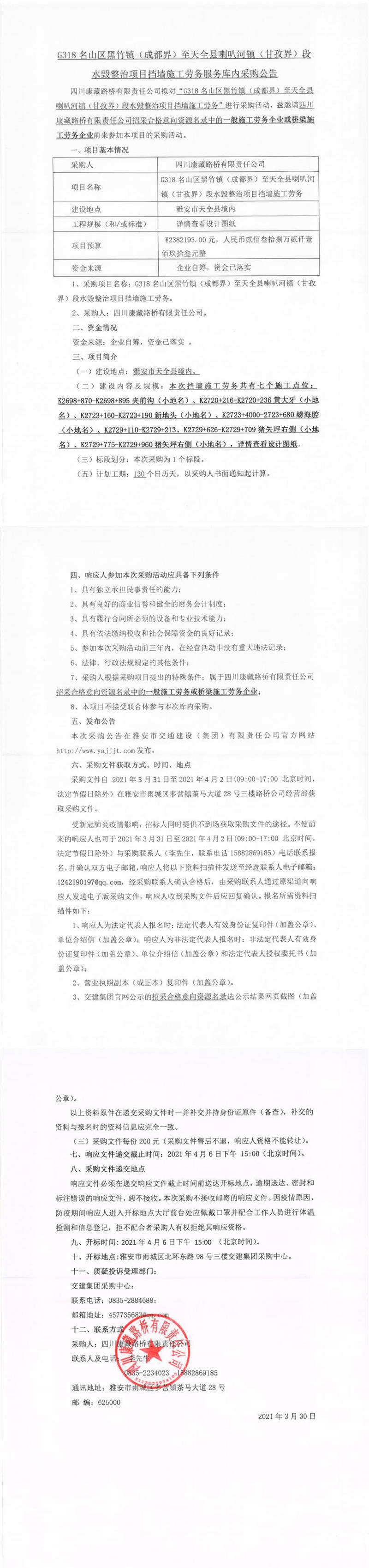 四川康藏路橋有限責(zé)任公司G318名山區(qū)黑竹鎮(zhèn)(成都界)至天全縣喇叭河鎮(zhèn)(甘孜界)段水毀整治項(xiàng)目擋墻施工勞務(wù)服務(wù)庫內(nèi)采購公告