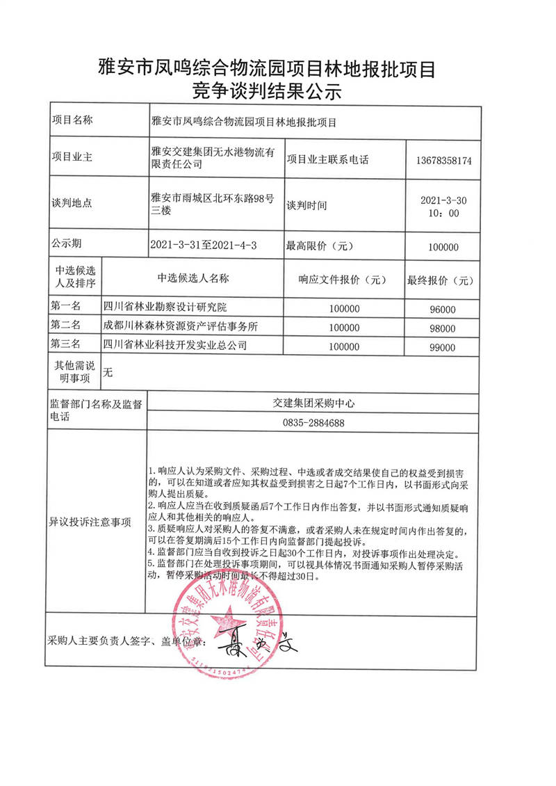 雅安交建集團無水港物流有限責任公司雅安市鳳鳴綜合物流園項目林地報批項目競爭談判結(jié)果公示