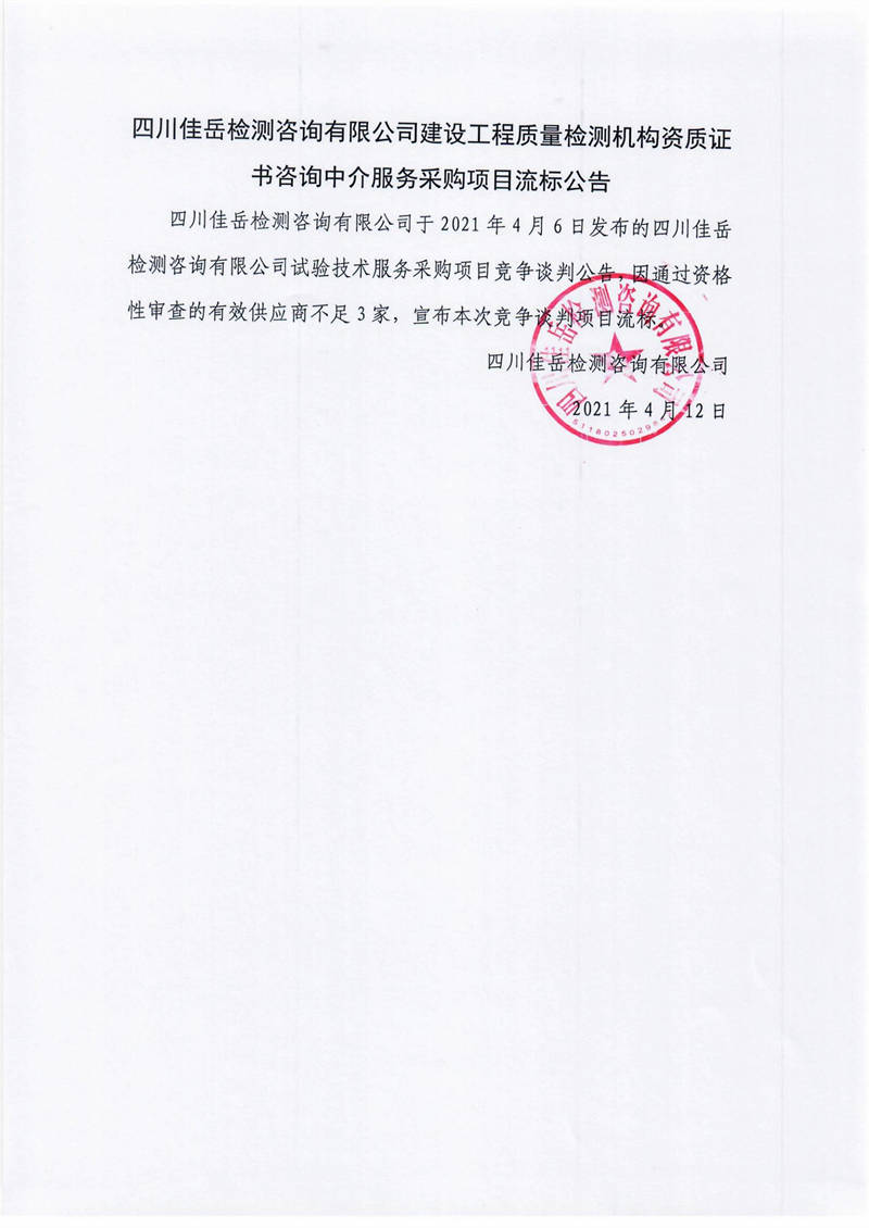 四川佳岳檢測咨詢有限公司建設工程質量檢測機構資質證書咨詢中介服務采購項目流標公告