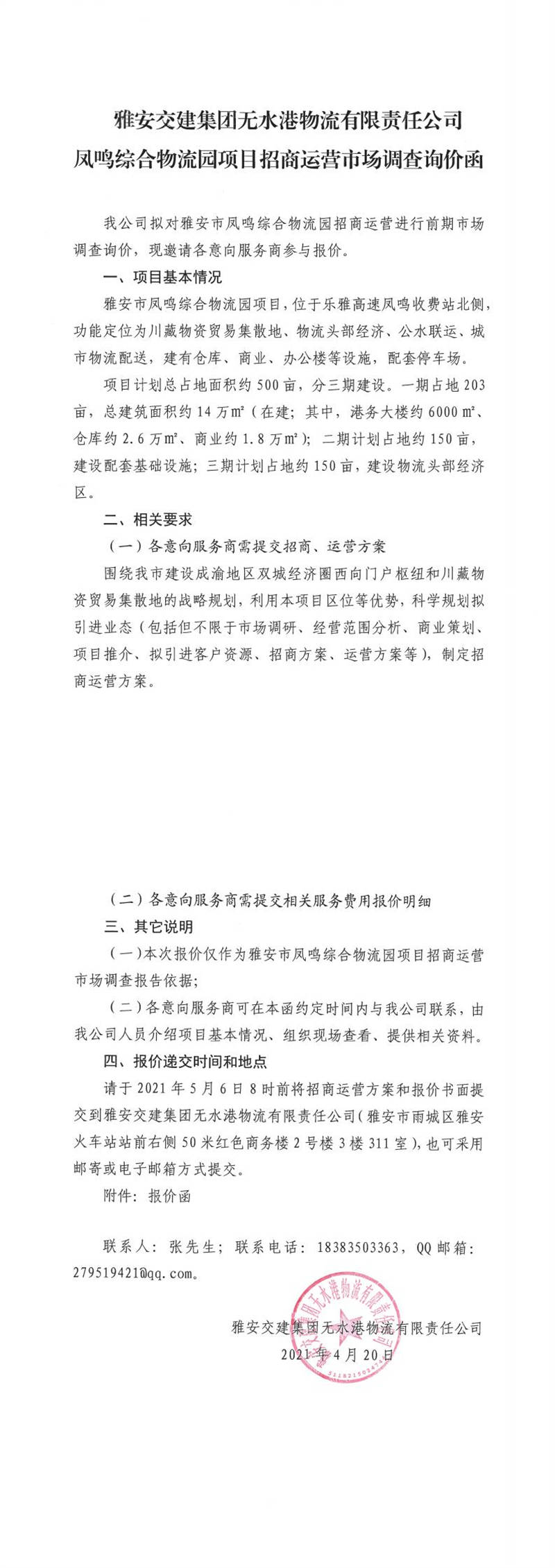 雅安交建集團無水港物流有限責(zé)任公司鳳鳴綜合物流園項目招商運營市場調(diào)查詢價函