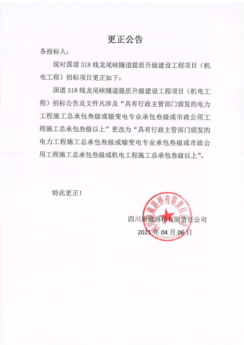 四川康藏路橋有限責(zé)任公司國道318線龍尾峽隧道提質(zhì)升級建設(shè)工程項目(機電工程)更正公告