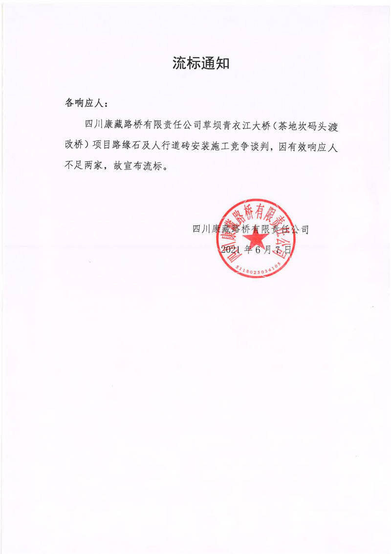 四川康藏路橋有限責(zé)任公司草壩青衣江大橋(茶地坎碼頭渡改橋)項(xiàng)目路緣石及人行道磚安裝施工競(jìng)爭(zhēng)談判流標(biāo)通知