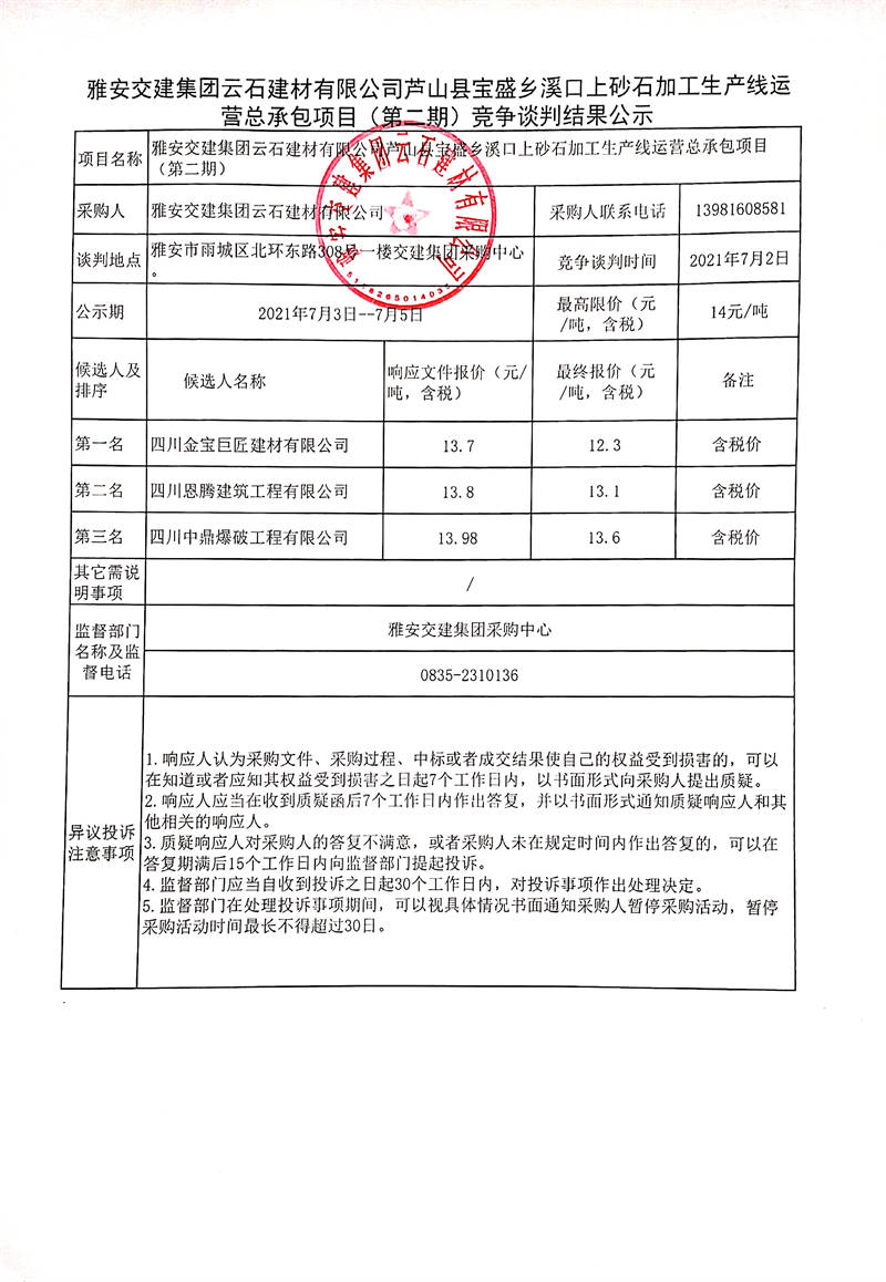 雅安交建集團(tuán)云石建材有限公司蘆山縣寶盛鄉(xiāng)溪口上砂石加工生產(chǎn)線運(yùn)營(yíng)總承包項(xiàng)目(第二期)競(jìng)爭(zhēng)談判結(jié)果公示