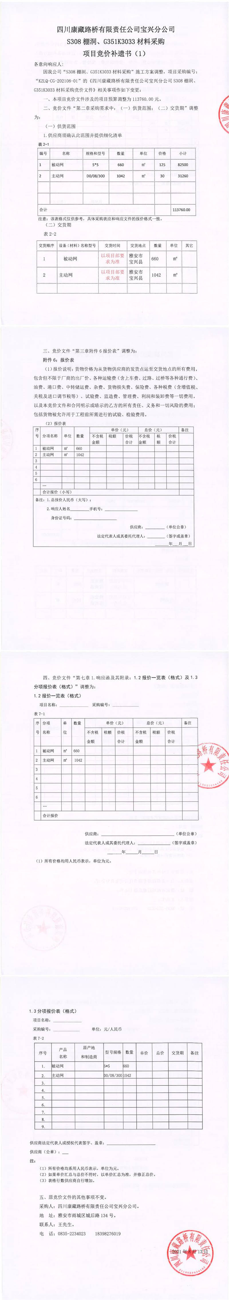 四川康藏路橋有限責(zé)任公司寶興分公司S308棚洞、G351K3033材料采購(gòu)項(xiàng)目競(jìng)價(jià)補(bǔ)遺書(1)