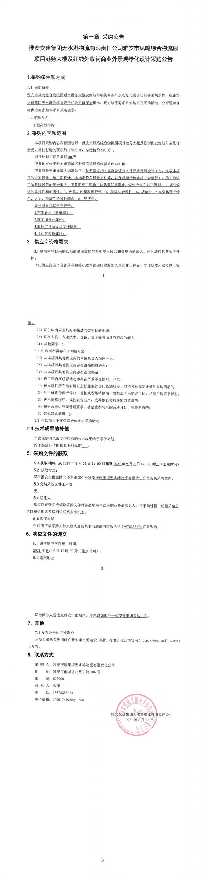 雅安交建集團(tuán)無水港物流有限責(zé)任公司雅安市鳳鳴綜合物流園項(xiàng)目港務(wù)大樓及紅線外臨街商業(yè)外景觀綠化設(shè)計采購公告