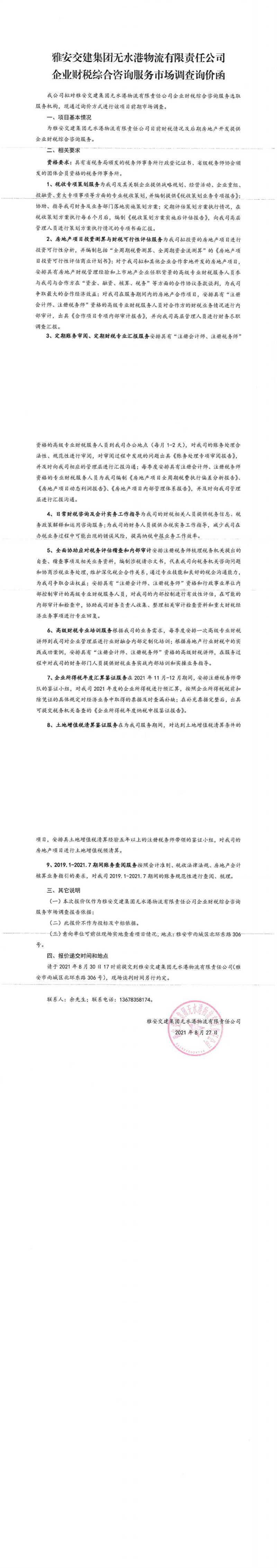 雅安交建集團(tuán)無(wú)水港物流有限責(zé)任公司企業(yè)財(cái)稅綜合咨詢服務(wù)市場(chǎng)調(diào)查詢價(jià)函