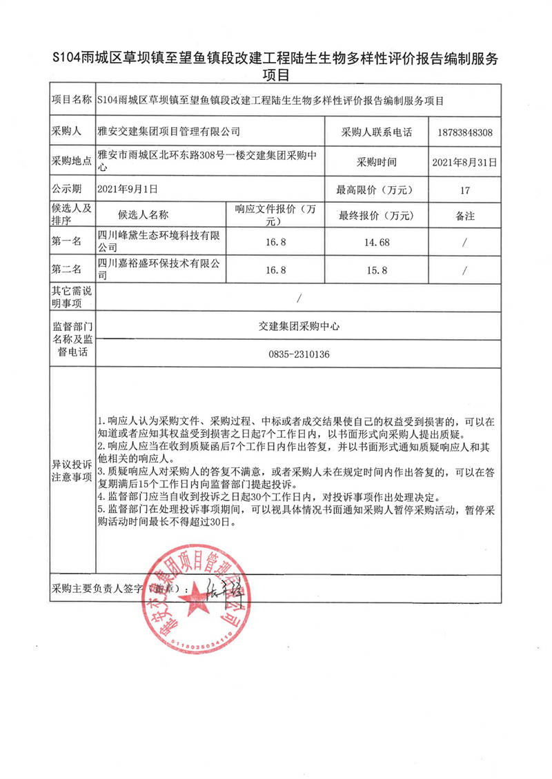 雅安交建集團(tuán)項(xiàng)目管理有限公司S104雨城區(qū)草壩鎮(zhèn)至望魚鎮(zhèn)段改建工程陸生生物多樣性評價(jià)報(bào)告編制服務(wù)項(xiàng)目評審結(jié)果公示