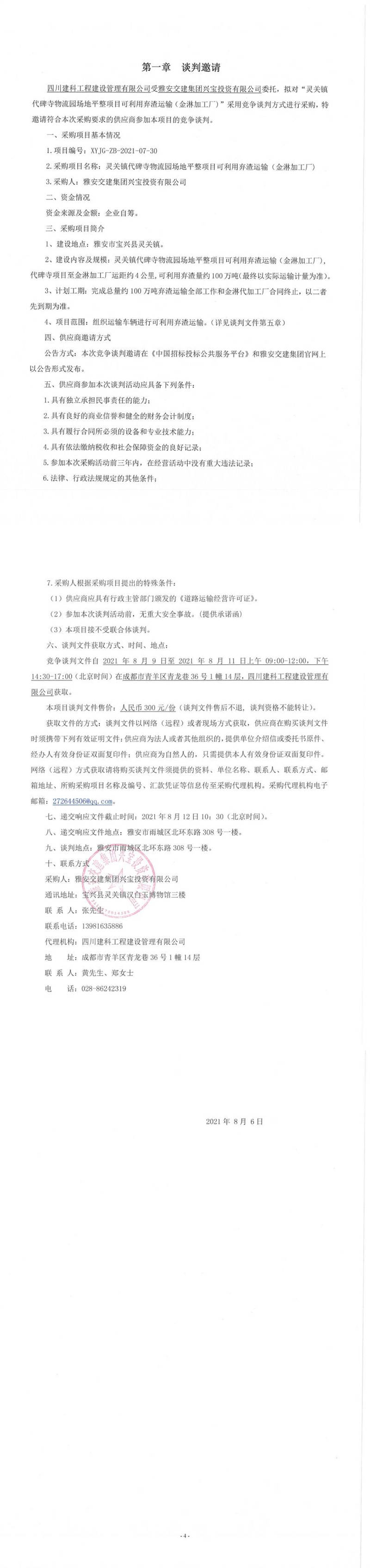 雅安交建集團興寶投資有限公司靈關(guān)鎮(zhèn)代碑寺物流園場地平整項目可利用棄渣運輸(金淋加工廠)競爭談判公告