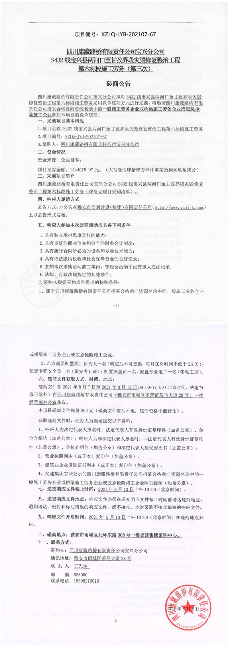 四川康藏路橋有限責任公司寶興分公司S432線寶興縣兩河口至甘孜界段災(zāi)毀修復整治工程第六標段施工勞務(wù)(第三次)競爭磋商公告