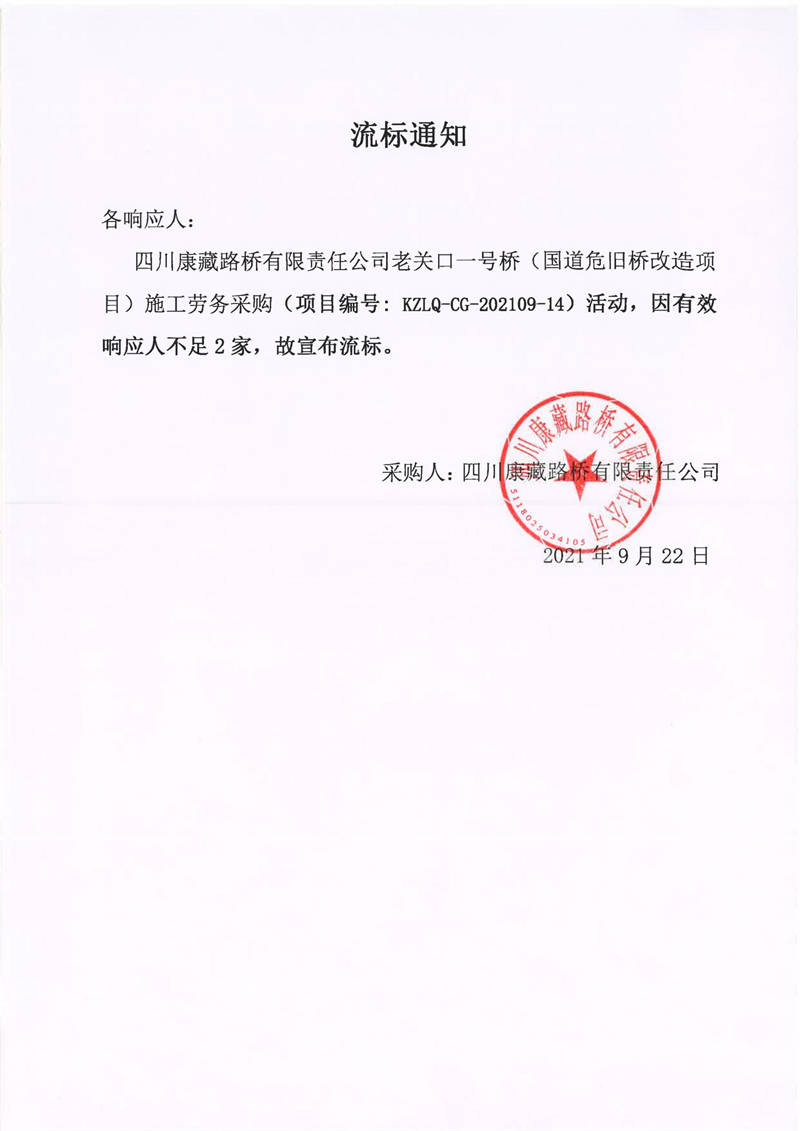 四川康藏路橋有限責(zé)任公司老關(guān)口一號橋(國道危舊橋改造項目)施工勞務(wù)采購流標(biāo)通知