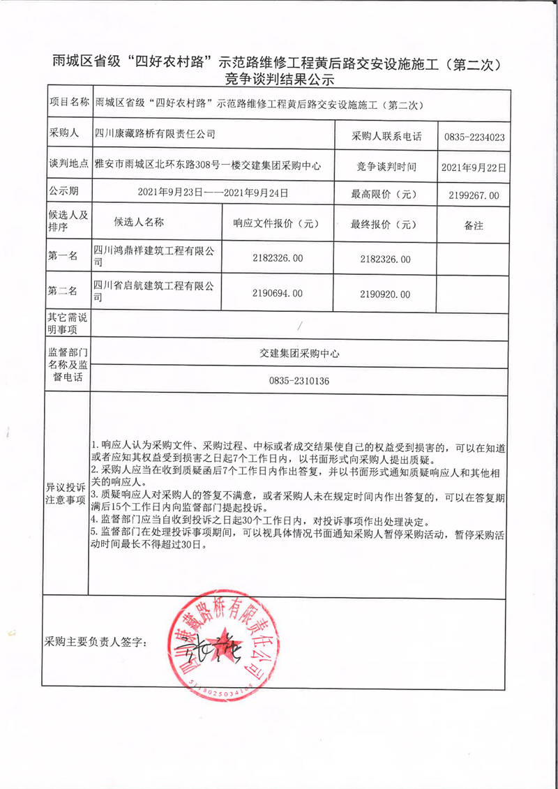 四川康藏路橋有限責(zé)任公司雨城區(qū)省級(jí)“四好農(nóng)村路”示范路維修工程黃后路交安設(shè)施施工(第二次)競爭談判結(jié)果公示