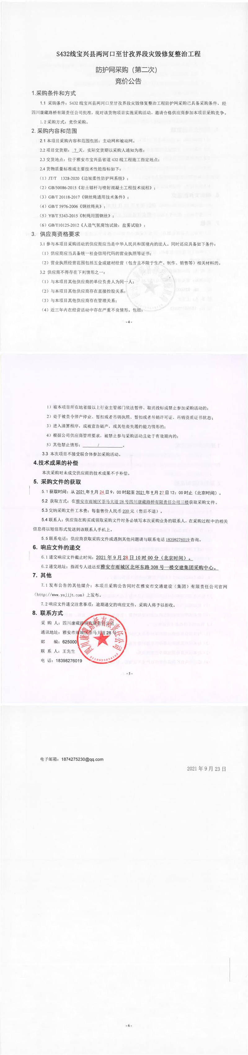 四川康藏路橋有限責(zé)任公司S432線寶興縣兩河口至甘孜界段災(zāi)毀修復(fù)整治工程防護(hù)網(wǎng)采購(gòu)(第二次)競(jìng)價(jià)公告